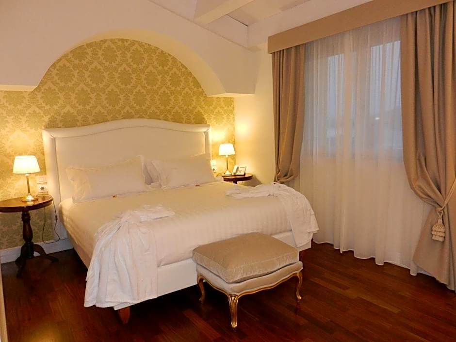 Elegant room with free Wi-Fi, LED TV and parquet floors. It overlooks the garden and pool, and the bathroom is complete with bathrobes and slippers.
